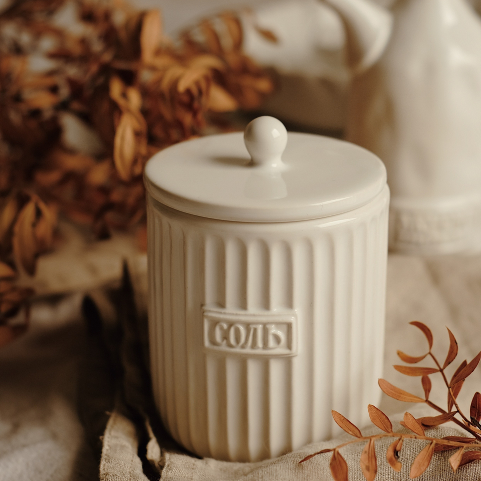 Банка для соли, емкость для хранения соли с крышкой и надписью Соль, текстурная, рифленая, белая, глянцевая, ручная работа. Высота 10см, с крышкой 11см, Диаметр:8,5см. Объем 300мл. Полуфарфор. Сахарница для сервировки чайного стола и для хранения