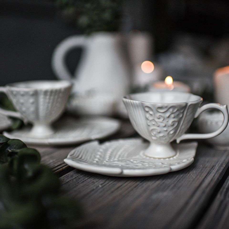 Блюдце в виде пера ручной работы, с рельефом в технике зенарт, белое сливочное полуматовое
