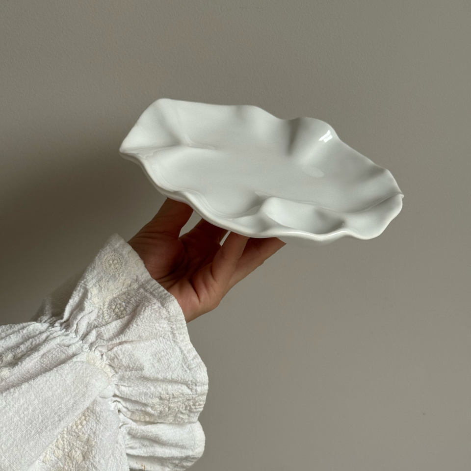 Блюдце в виде смятой ткани, ручная работа, белое, глянцевое, диаметр 17,5см с выемкой под джем