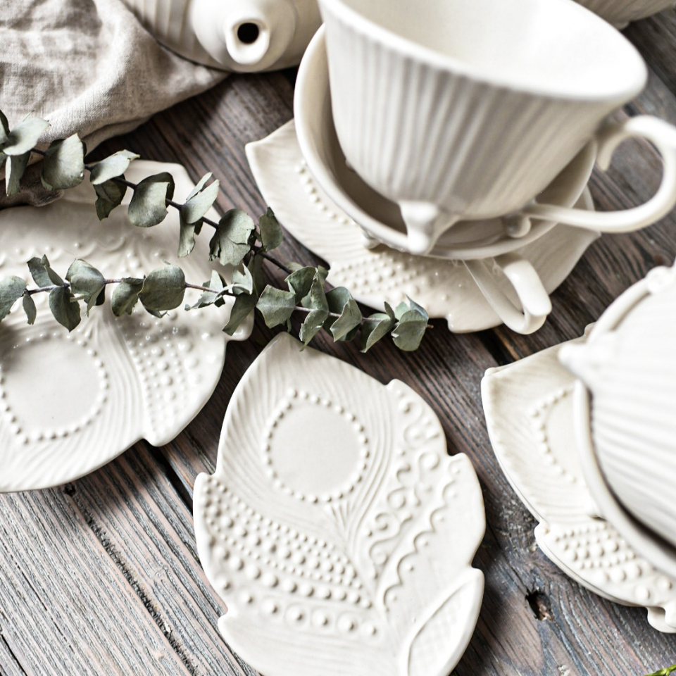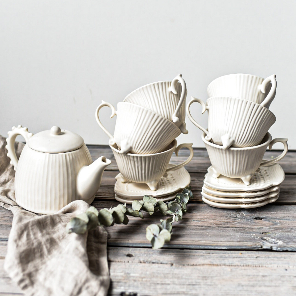 Чайный сервиз ручной работы на 6 персоны, белый, сливочный, полуматовый. Чайник 650мл (14см высота), 6 кружек на ножках 250мл, 6 блюдец в виде пера с тукстурной росписью.