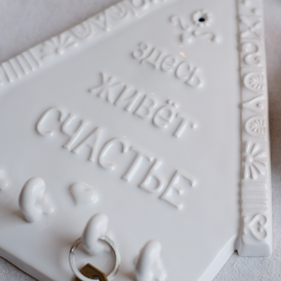 Ключница настенная из керамики ручной работы, текстурная роспись, надпись "Здесь живет счастье". Длина 24см, ширина 14см. Подвесная. С 4 крючками для ключей. Белая, глянцевая, мягкий фарфор