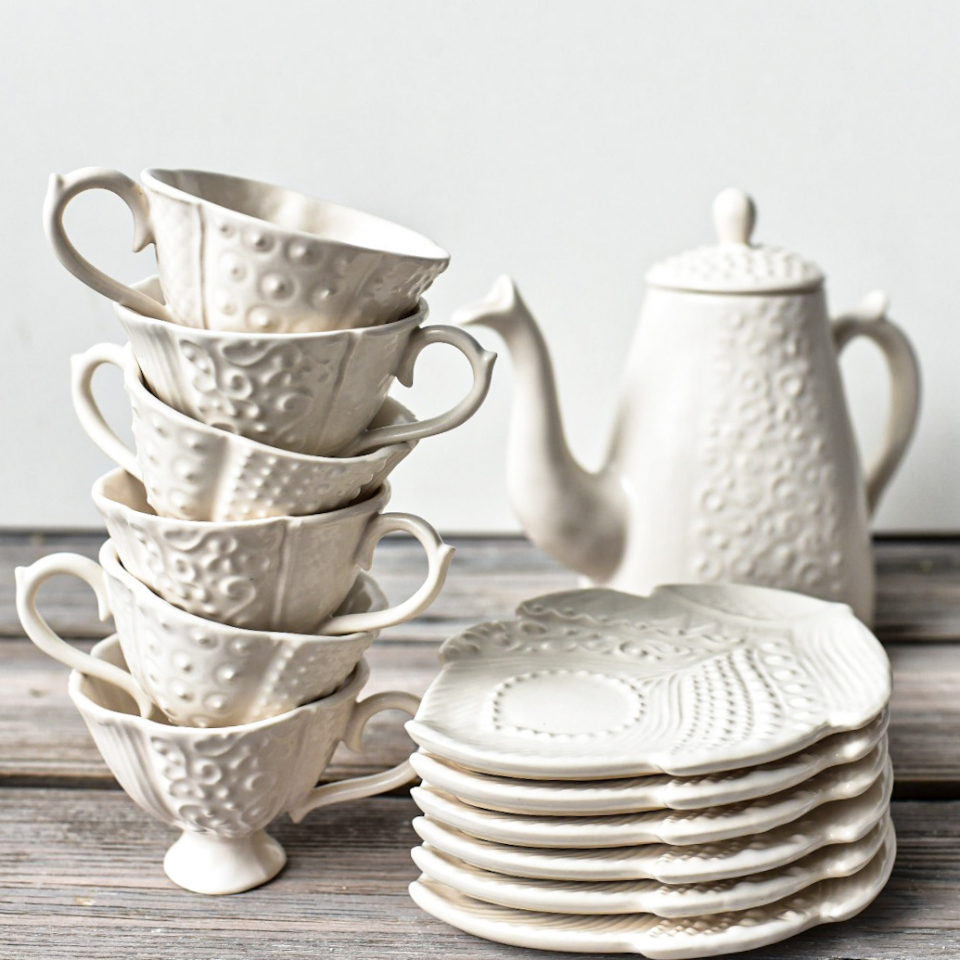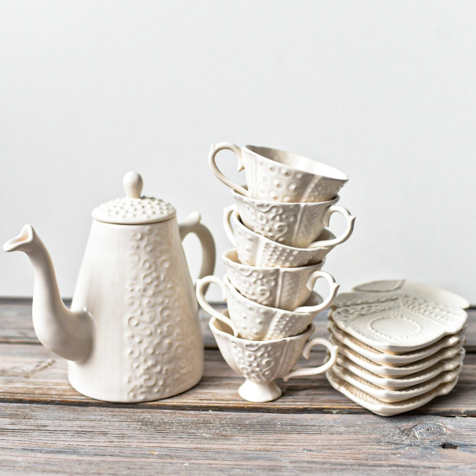 Кофейный сервиз ручной работы на 6 персоны, Белый, глянцевый. Кофейник 650мл (14см высота), 6 кружек 90мл с текстурной росписью, 6 блюдец в виде пера с тукстурной росписью.