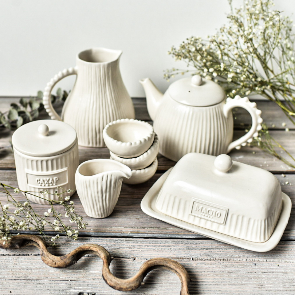 Набор посуды для красивой сервировки. 8 предметов. 3 соусника, масленка (18*13*10), кувшин 750мл, чайник 650мл, сливочник 90мл, сахарница 300мл,