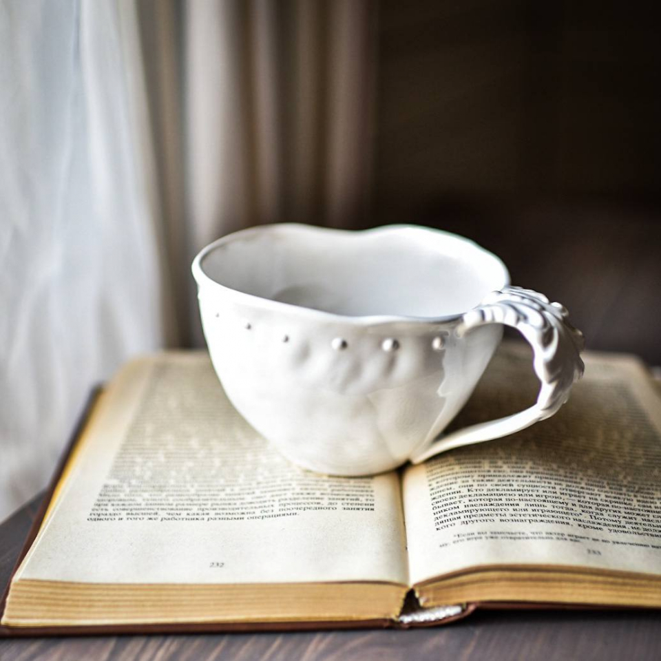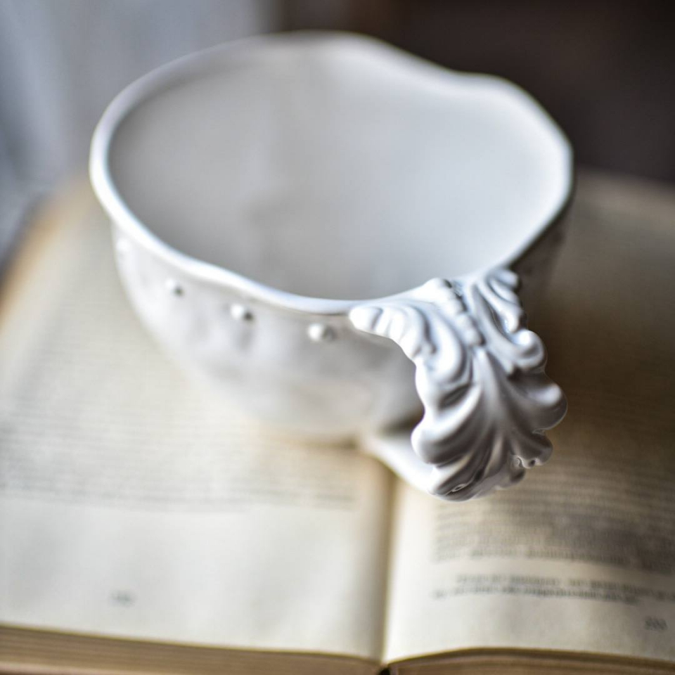 Большая кружка ручной работы на 450мл, высота 10см, диаметр 13см, с винтажной резной ручкой и мятой формой. В Коллекции Белый Жемчуг. Мягкий фарфор, белая, глянцевая.