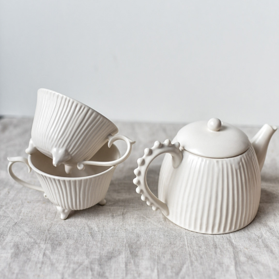 Набор чайный, белый сливочный, чайник 600мл, высота 12см, 2 кружк на ножках и 250мл в текстурную полоску, высота 7см