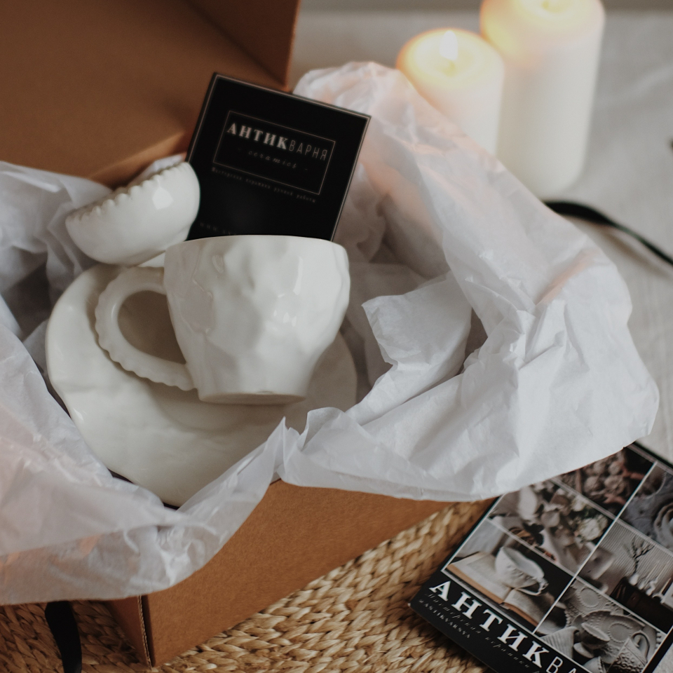 Подарочный набор в стильной крафтовой упаковке: Мятая кружка ручной работы, мятое блюдца ручной работы и соусник. Полуфарфор
