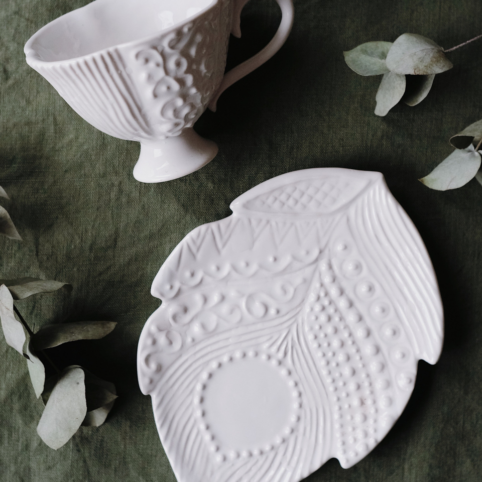 Подарочный набор в стильной крафтовой упаковке: 2 кофейные чашки 90мл с текстурной росписью, 2 блюдца в виде пера с текстурной роспись. Полуфарфор,ручная работа, белый