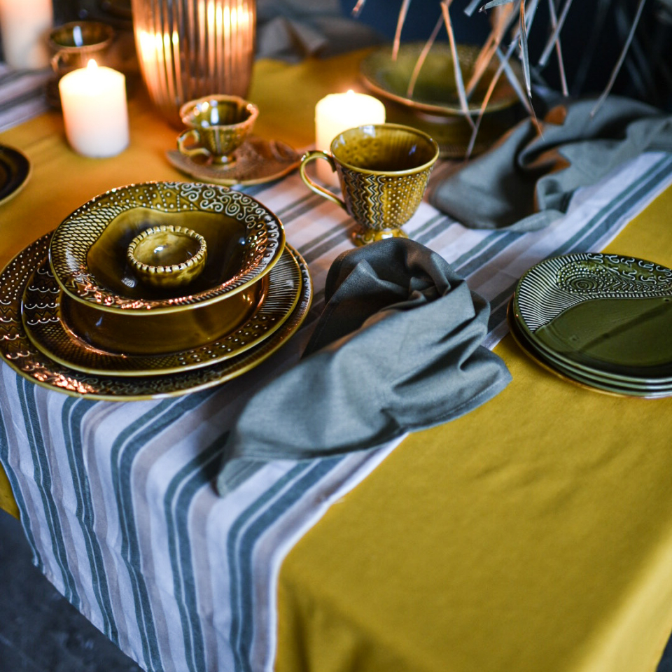Набор дорожек для сервировки. 2 штуки. Цвет: бежево-оливковый, в полоску. Размер: 35*130. Состав: 40% Лен, 43% Вискоза, 17% Хлопок