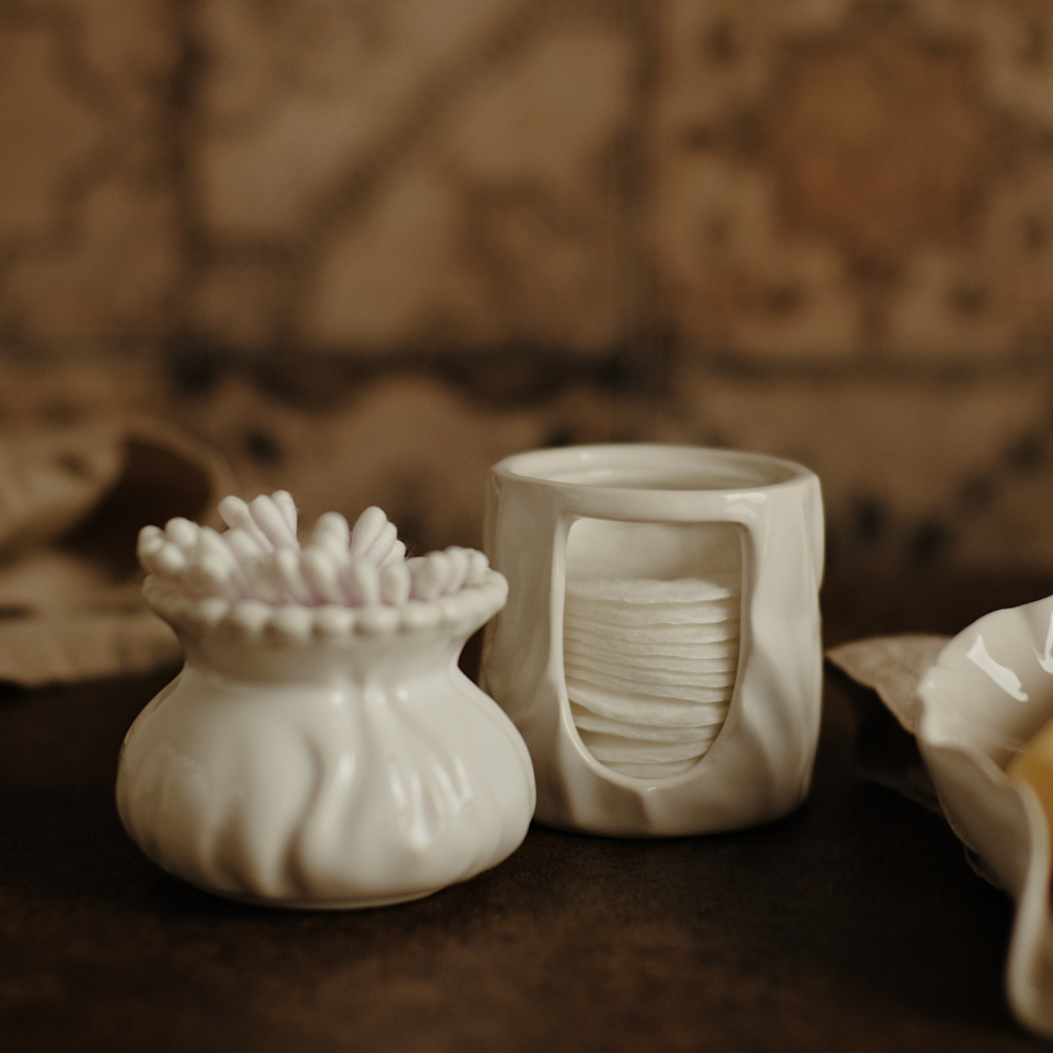 Органайзер для ватных дисков и палочек. Состоит из 2 частей - подставка для ватных дисков (высота 7см) и подставка для ватных палочек (высота 6см). Подставки могут стоять как по отдельности, так и друг на друге для экономии места на полке. Идеально справляется с задачей эстетичного хранения в ванной комнате. Керамика ручной работы, мягкий фарфор, белая глянцевая.