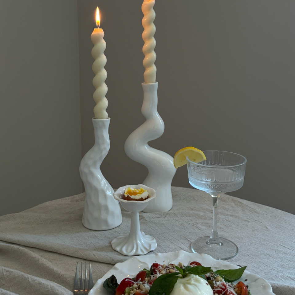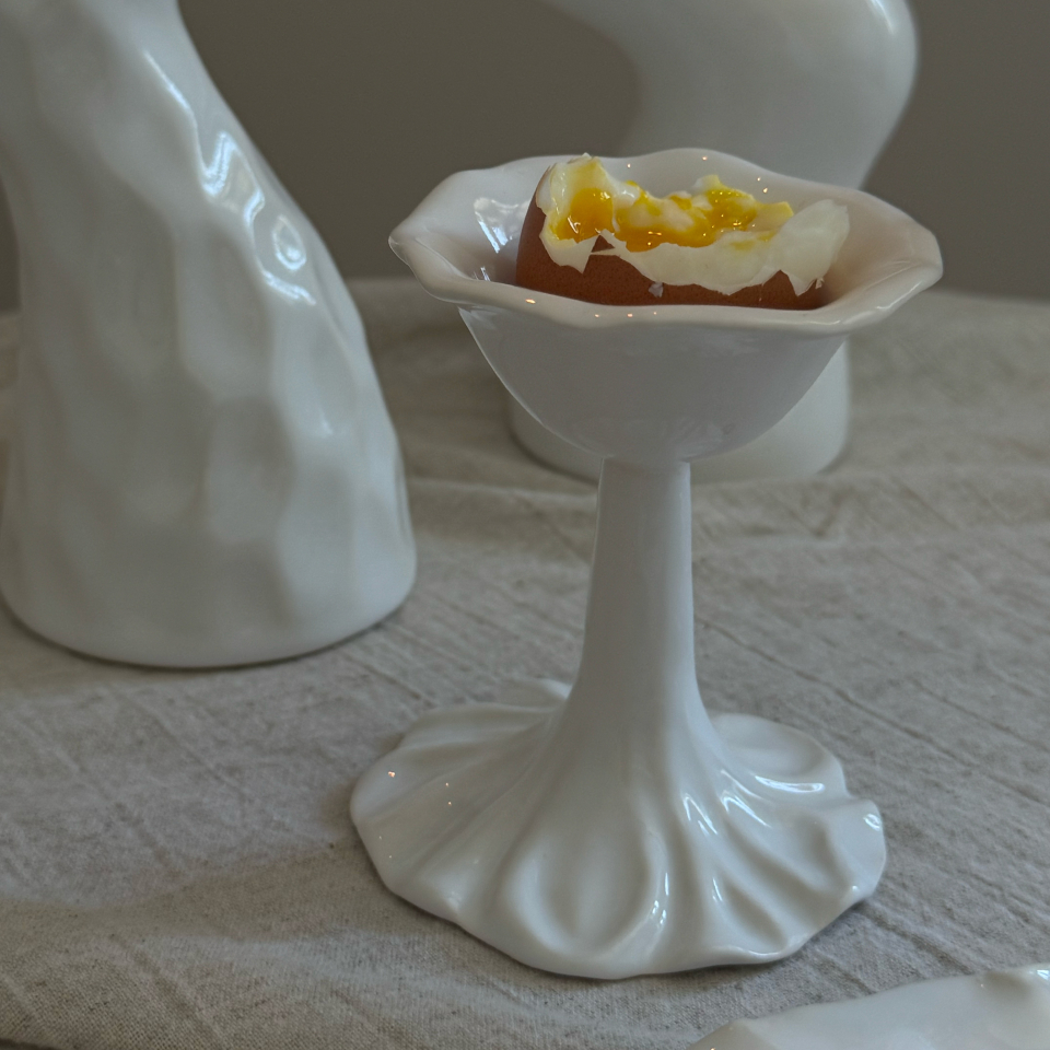Подставка для яйца ручной работы на высокой ножке, текстура смятой ткани. Белая, глянцевая, мягкий фарфор