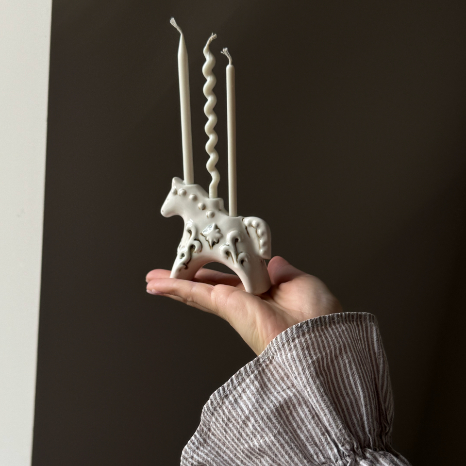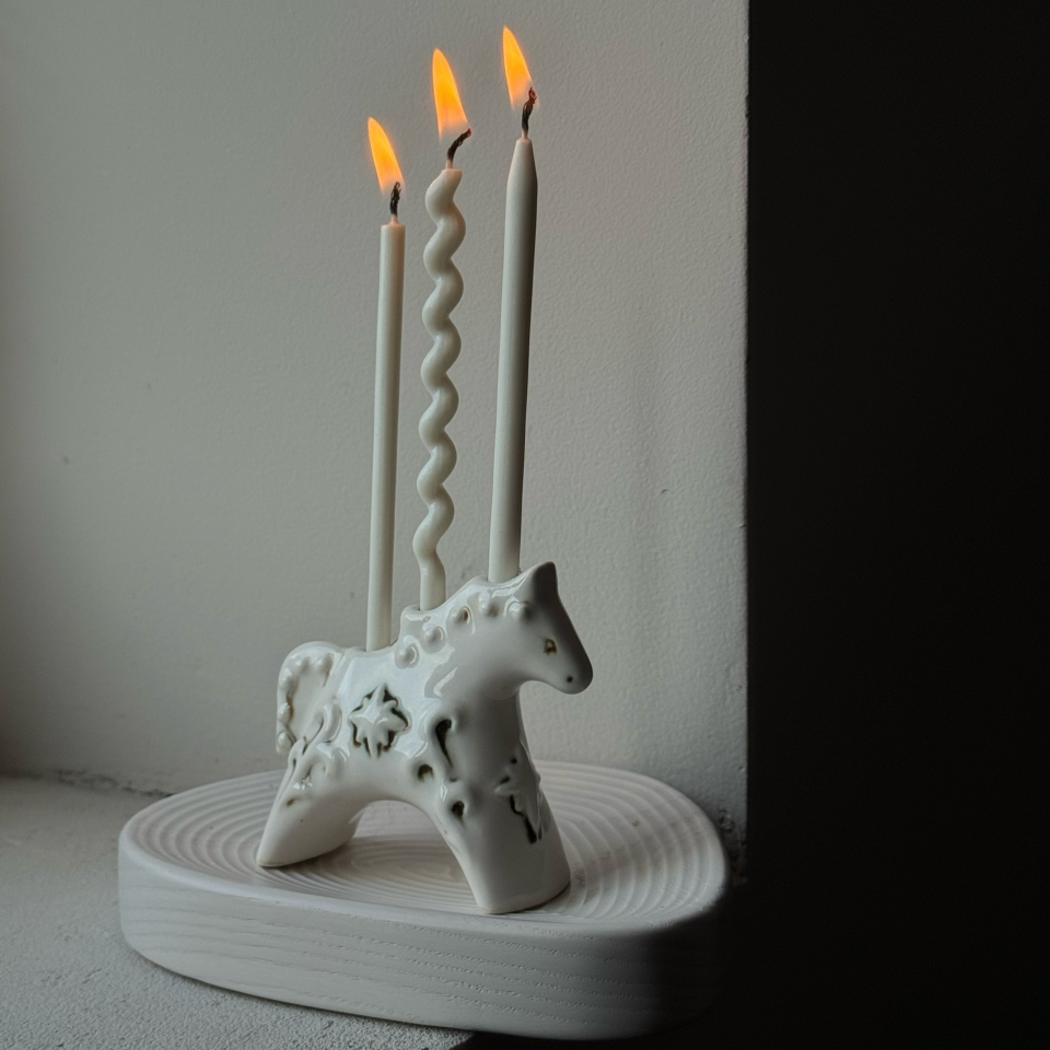 Подсвечник для тонкой церковной свечи, керамика ручной работы, мягкий фарфор, бежевая с патиной и винтажным эффектим состаривания. Текстурная роспись. Символ счастья в Новом 2026 году, символ года 2026, в форме расписной лошадки. Высота 7,5см