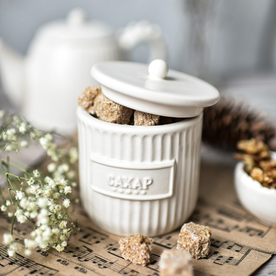 Сахарница с крышкой и надписью Сахар, текстурная, рифленая, белая, глянцевая, ручная работа.Высота 10см, с крышкой 11см, Диаметр:8,5см. Объем 300мл. Полуфарфор. Сахарница для сервировки чайного стола и для хранения