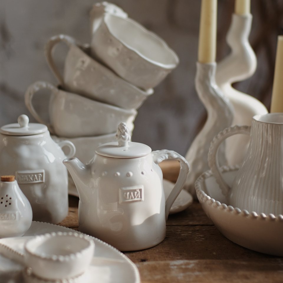 Гигантский сервиз ручной работы,включающий подсвечники и аксессуары,стилизованные под всюколлекцию - готовое решение для дома. 6 персон, 45 предметов:6 больших тарелок с оттиском растений 27см, 6 средних тарелок 22см, 6 пиал 350мл, 1 Блюдо глубокое 26см, 1 Кувшин 750мл, 3 соусника, 1 менажница 26см, 1 блюдо «Жемчуг винтаж», 3 разноуровневых подсвечника «Загогулины», Солонка и перечницас надписью «Соль» «перец», Бутылочка для растительного масла с написью «Масло», 6 больших руколепных кружек на 450мл, 6 блюдец 17см, чайник 650мл с надписью Чай, сахарница на 650мл с надписью Сахар. Белый глянцевый. Можно мыть в посудомойке.