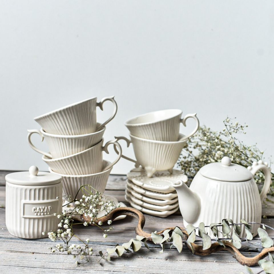 Чайный сервиз ручной работы на 6 персоны, 14 предметов, Белый, глянцевый. Чайник 650мл (14см высота), сахарница 300мл, 6 кружек на ножках 250мл, 6 блюдец в виде пера с тукстурной росписью.