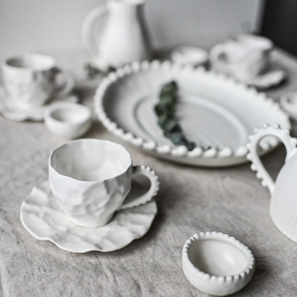 Авторский экзсклюзивный чайный сервиз ручной работы на 6 персон. 49 предметов: 6 чайных чашек 250мл, 6 блюдец, 6 соусников, 6 подстановочных тарелок 27см, 6 обеденных тарелок 22см, 6 пиал, 1 кувшин на 750мл, 1 чайник 600мл , 1 сахарница 300мл 1 блюдо 25 на 23см, 1 салатница в виде ракушки, 1 блюдо в виде ракушки, тортовница, 6 колец для салфеток. Всю посуду можно мыть в посудомойке и ставить в СВЧ. Материал - мягкий фарфор. Цвет - Белый, глянцевый