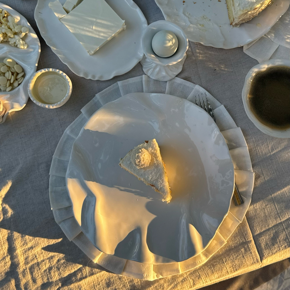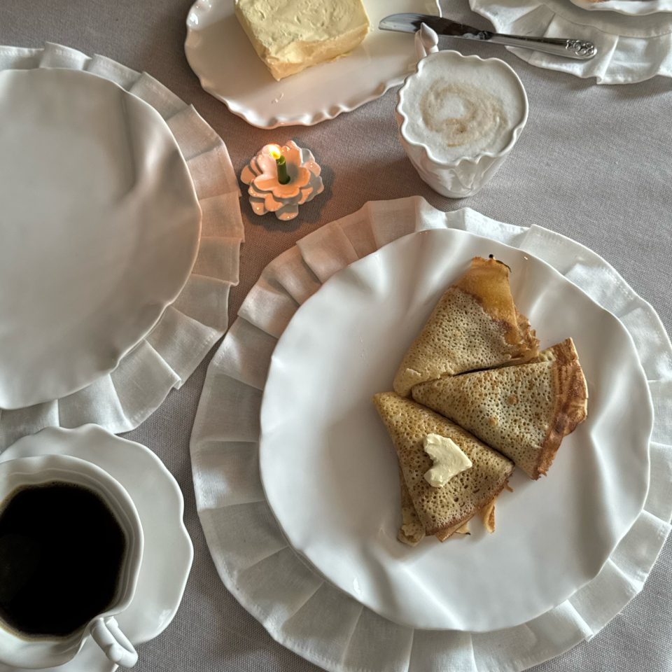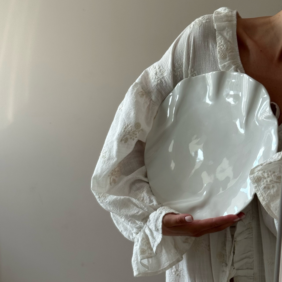 Тарелка ручной работы с нежными воланами, подстановочная, диаметр 27см, мягкий фарфор, белая, глянцевая. Можно мыть в посудомойке. Сочетается со всей коллекцией Белый Жемчуг