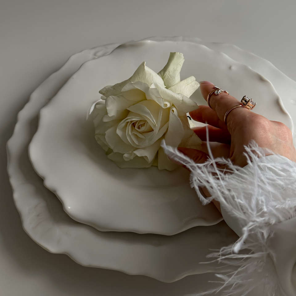 Тарелка из мягкого фарфора в виде тонкого лепестка. Диаметр 22см, белая сливочная. Тонкая, легкая, но очень прочная.
