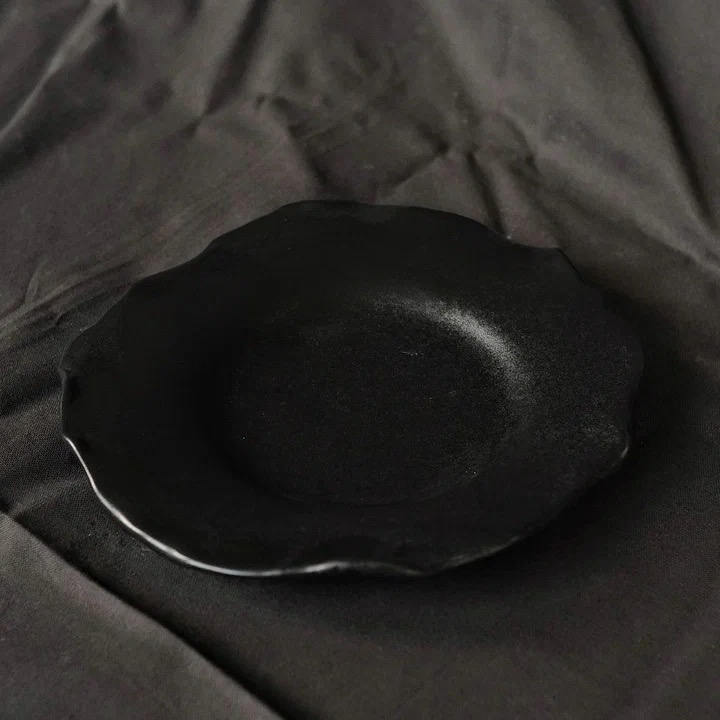 Тарелка из мягкого фарфора в виде тонкого лепестка. Диаметр 22см, черная, матовая (сатиновая текстура). Тонкая, легкая, но очень прочная.