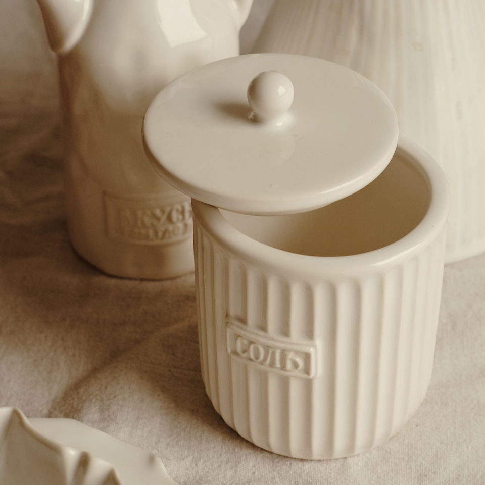 Банка для соли, емкость для хранения соли с крышкой и надписью Соль, текстурная, рифленая, белая, глянцевая, ручная работа. Высота 10см, с крышкой 11см, Диаметр:8,5см. Объем 300мл. Полуфарфор. Сахарница для сервировки чайного стола и для хранения