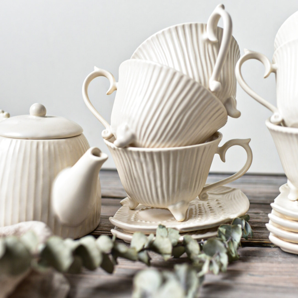 Чайный сервиз ручной работы на 6 персоны, белый, сливочный, полуматовый. Чайник 650мл (14см высота), 6 кружек на ножках 250мл, 6 блюдец в виде пера с тукстурной росписью.