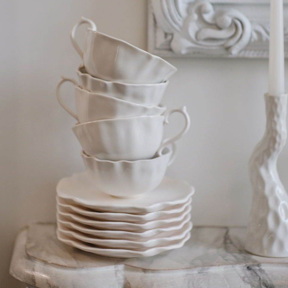 Чайный сервиз ручной работы. 12 предметов: 6 чашек 380мл, 6 тблюдец 16см. Белый, глянцевый, мягкий фарфор