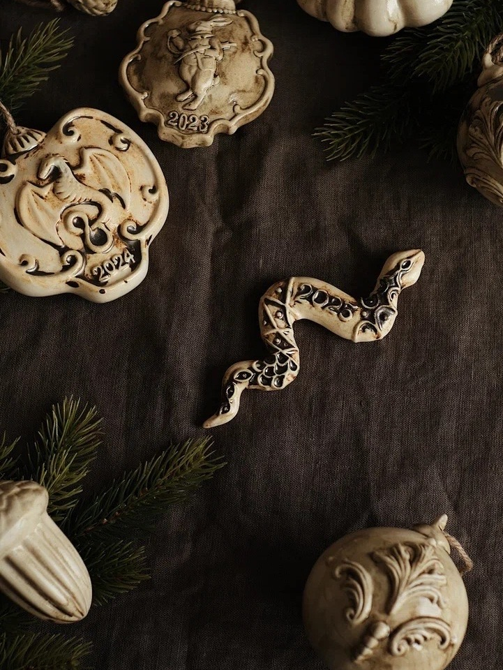 Елочная игрушка ручной работы в виде символа года 2025 Змеи с текстурной росписью. Талисман счастья, который должен принести удачу в Новом Году. Мягкий фарфор. Бежевый с патиной. Ручная работа. Вес - 70гр, длина 15см