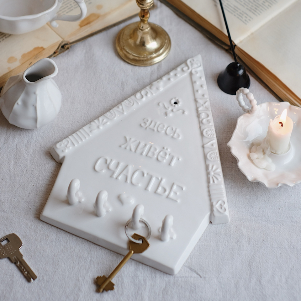 Ключница настенная из керамики ручной работы, текстурная роспись, надпись "Здесь живет счастье". Длина 24см, ширина 14см. Подвесная. С 4 крючками для ключей. Белая, глянцевая, мягкий фарфор