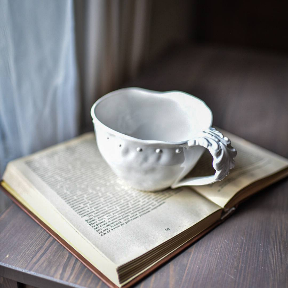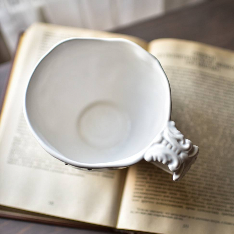 Большая кружка ручной работы на 450мл, высота 10см, диаметр 13см, с винтажной резной ручкой и мятой формой. В Коллекции Белый Жемчуг. Мягкий фарфор, белая, глянцевая.