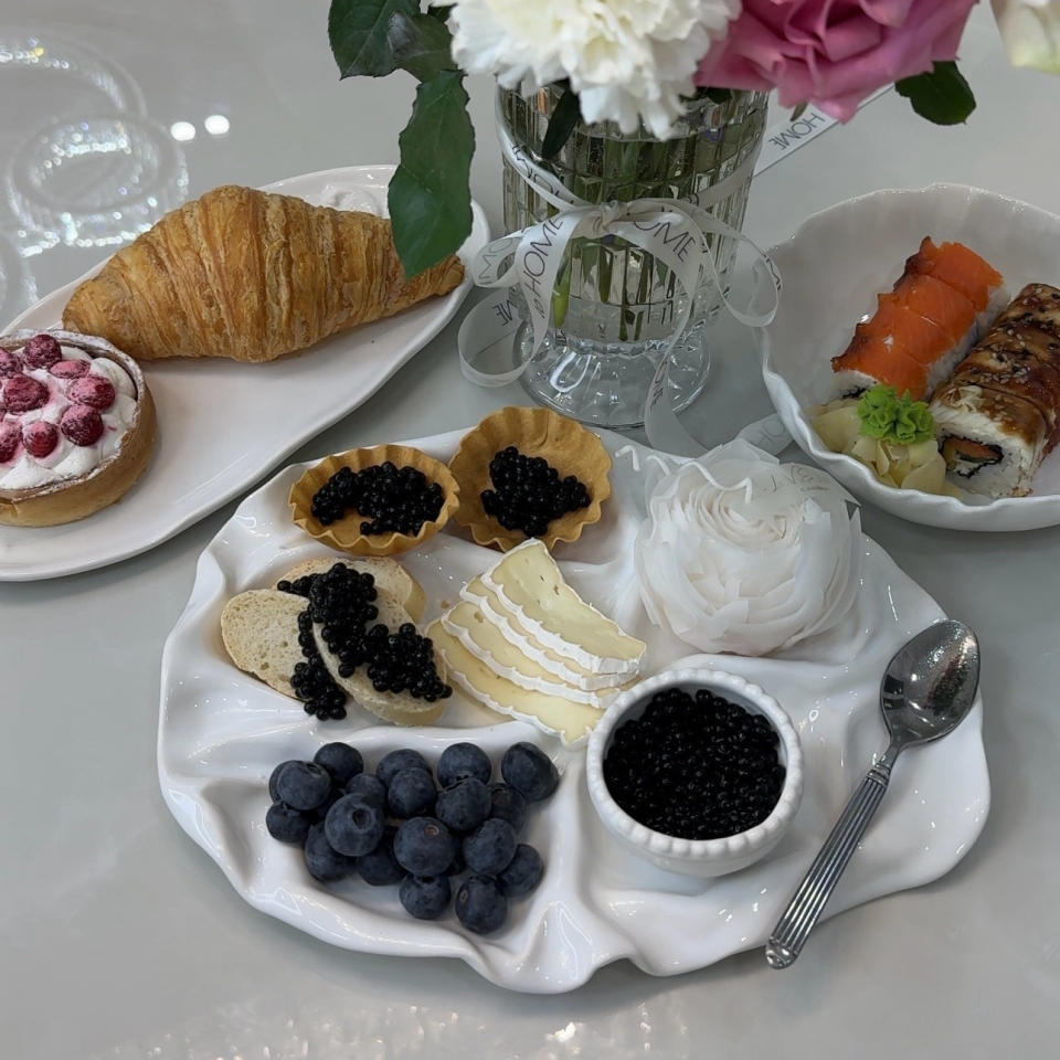 Менажница ручной работы в виде смятой ткани, мягкий фарфор, белая, глянцевая, длина 29см, ширина 23м, 6 секций для закусок