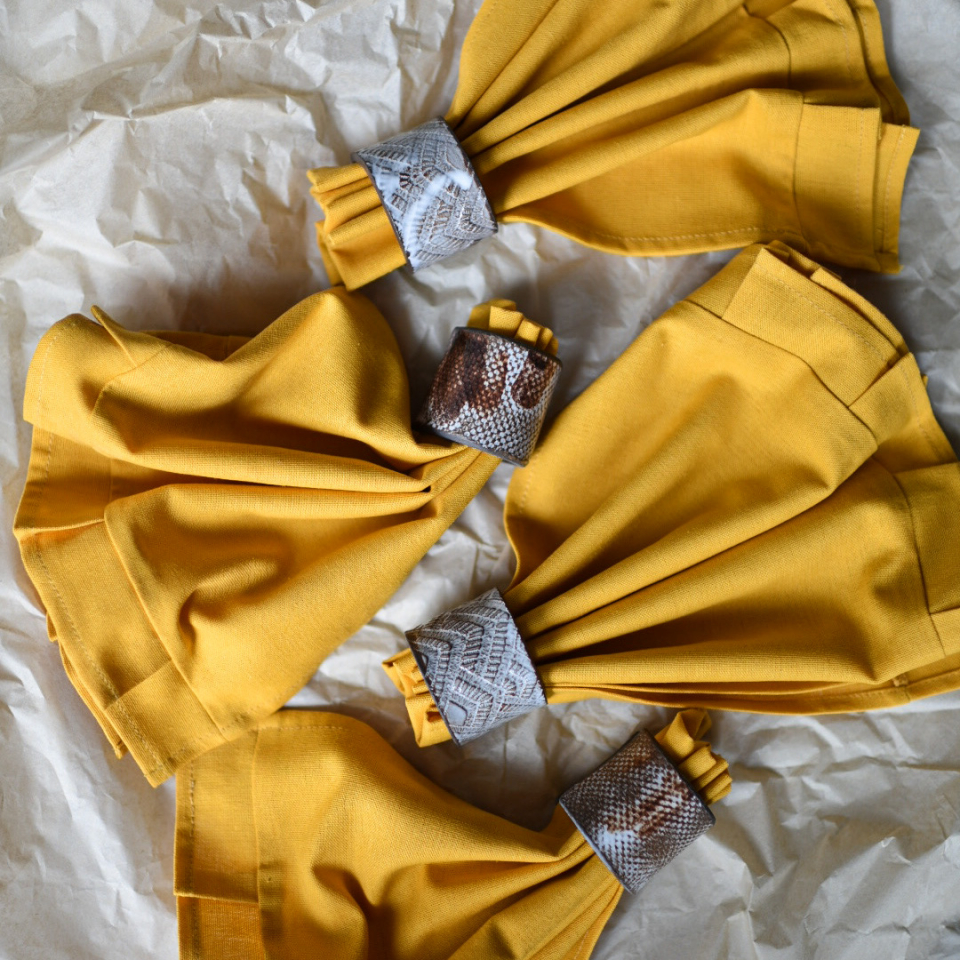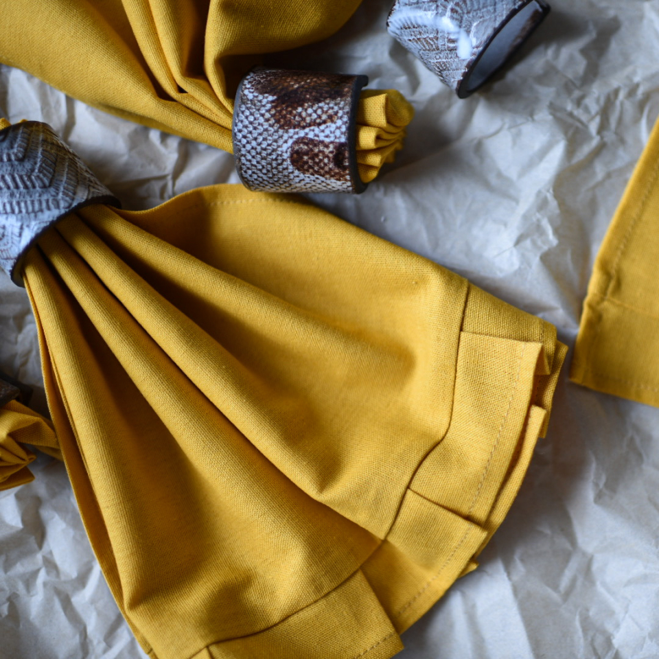 Набор салфеток для сервировки с декоративным кантом. 4 штуки. Цвет: горчичный. Размер: 35*50см. Состав: 40% Лен, 43% Вискоза, 17% Хлопок