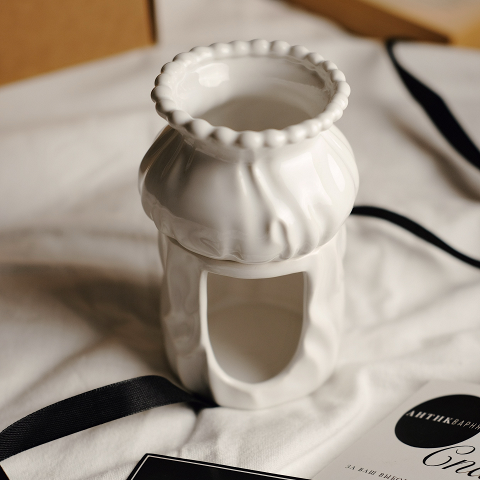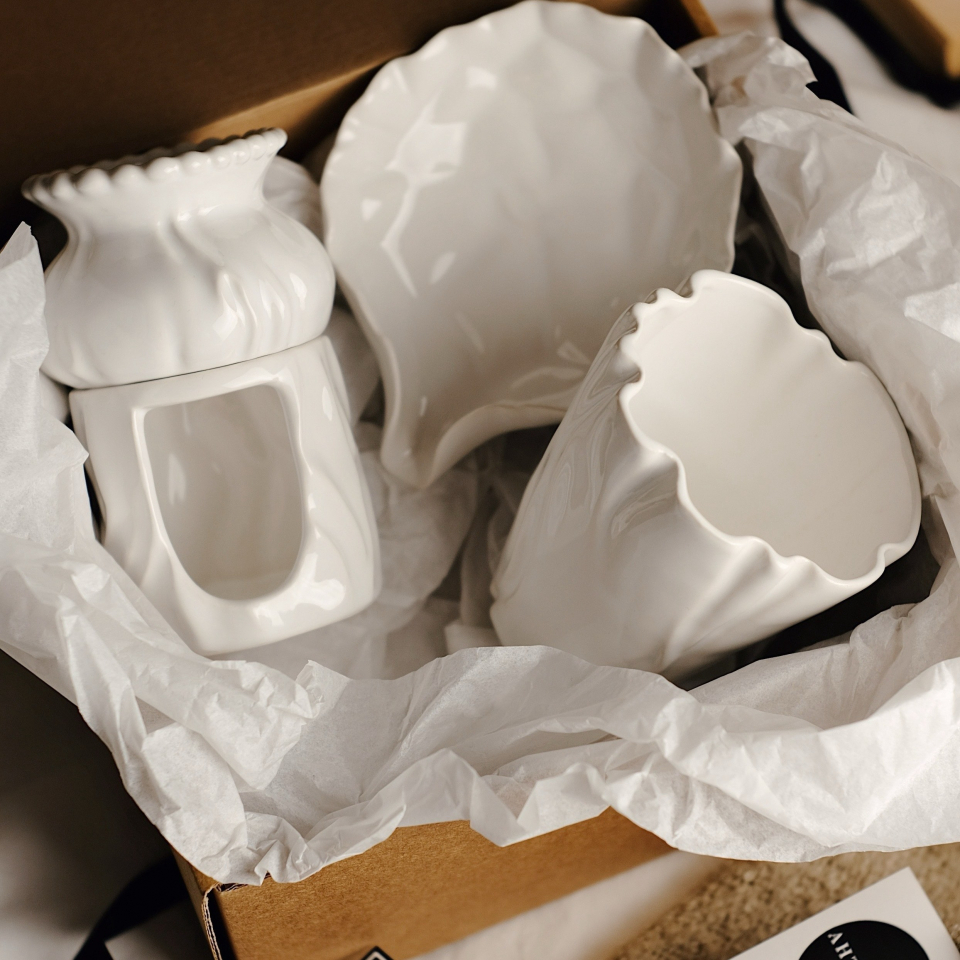 Подарочный набор аксессуаров для ванной из керамики ручной работы в подарочной упаковке. Состав: Мыльница со сливом с мятыми ажурными краями. Подходит под все универсальные размеры мыла (максимальный размер мыла 9см на 6см). Благодаря сливу вода не скапливается в мыльнице. Органайзер для ватных дисков и палочек. Состоит из 2 частей - подставка для ватных дисков (высота 7см) и подставка для ватных палочек (высота 6см). Стакан с волнистыми краями для зебных счеток, подставка для косметики, а также может использоваться как стакан для питья. Высота 10см, диаметр 9см. Мягкий фарфор, белый, глянцевый, ручная работа. Дизайн коллекции Белый Жемчуг.