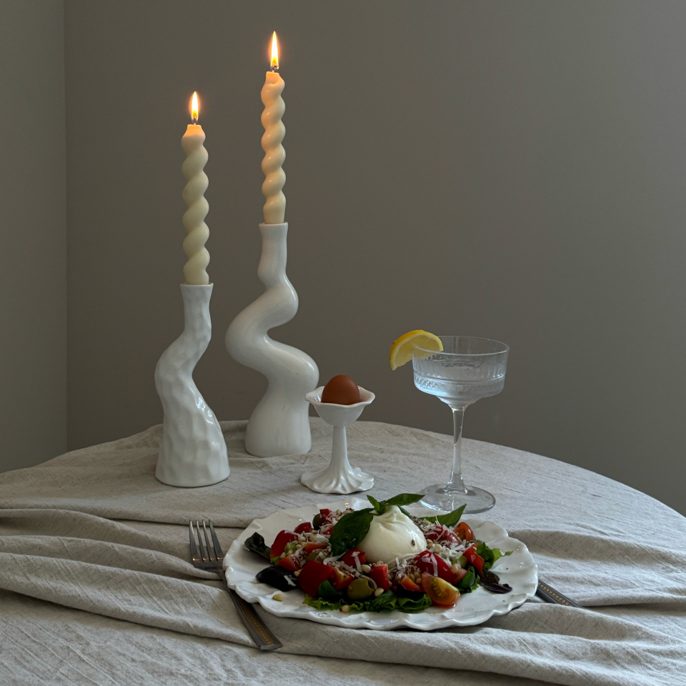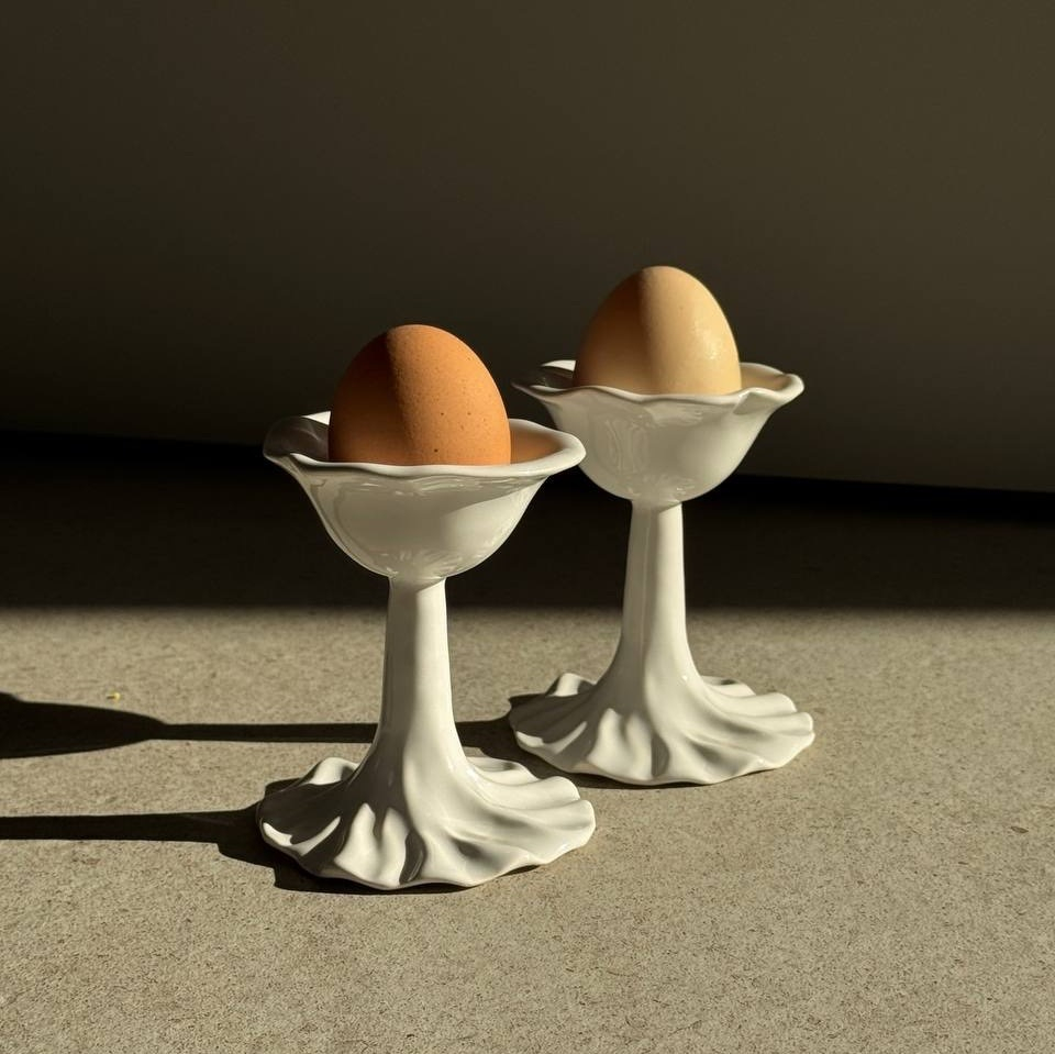 Подставка для яйца ручной работы на высокой ножке, текстура смятой ткани. Белая, глянцевая, мягкий фарфор