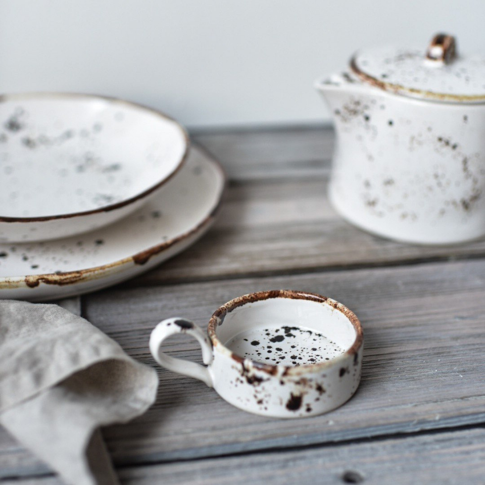 Соусник минималистичный с ручкой ручной работы. Белый, посыпанный крошкой. Соусник стилизованный под алюминиевую посуду. Керамика, полуфарфор