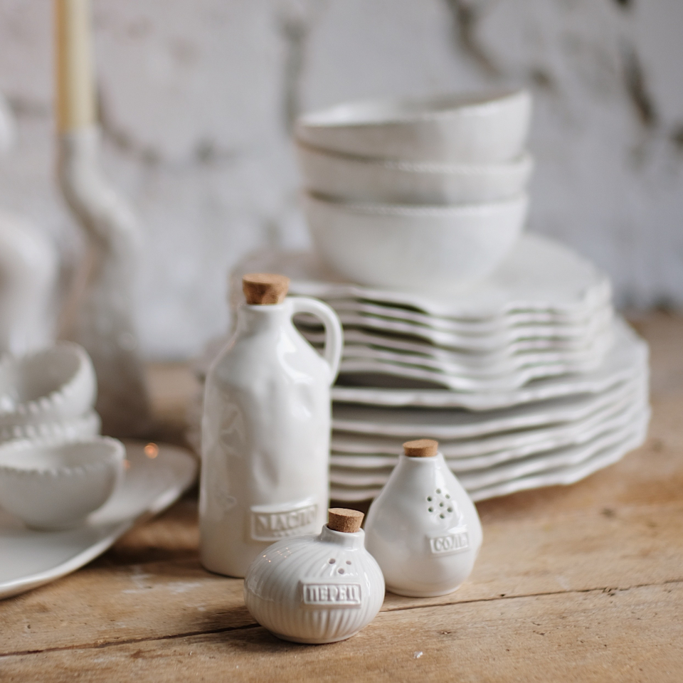 Сервиз на 6 персон: 31 предмет: 6 больших тарелок с оттиском растений 27см, 6 средних тарелок 22см, 6 пиал 350мл, 1 Блюдо глубокое 26см, 1 Кувшин 750мл, 3 соусника, 1 менажница 26см, 1 блюдо «Жемчуг винтаж», 3 разноуровневых подсвечника «Загогулины», Солонка и перечницас надписью «Соль» «перец», Бутылочка для растительного масла с написью «Масло». Ручная работа, белый глянцевый, мягкий фарфор, можно мыть в посудомойке.